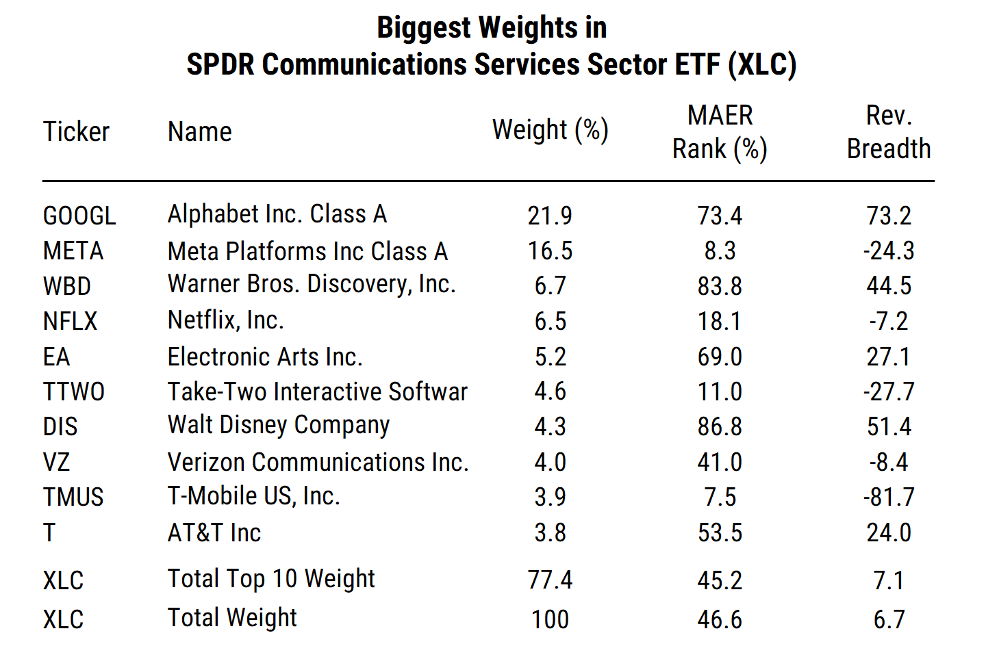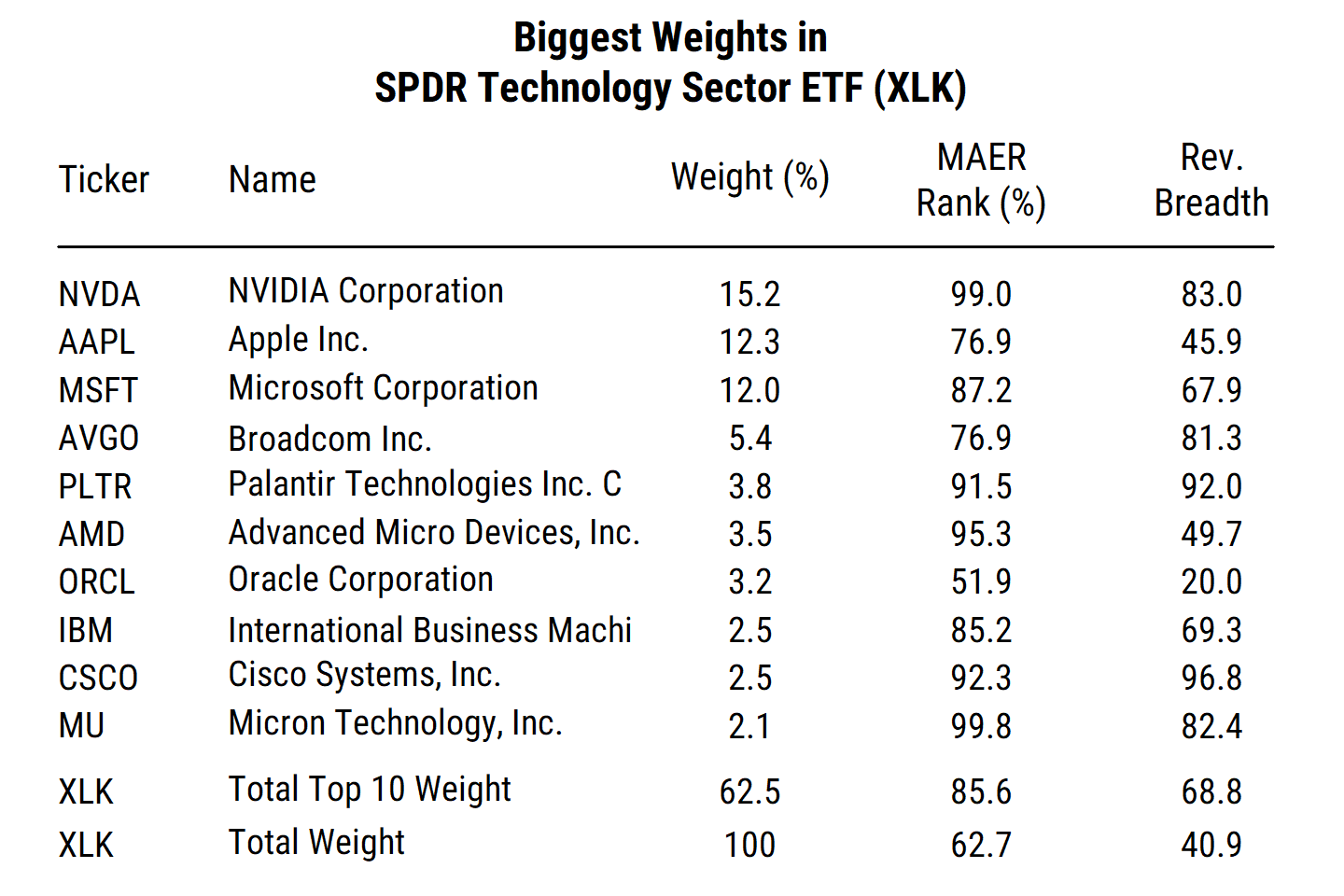 Meanwhile, in the Tech sector (XLK), we see that all 10 of the largest stocks in the sector have solidly positive revisions breadth, including the “big three” of NVIDIA, Apple, and Microsoft. The average MAER ranking for the top 10 is 86%, an extremely high reading, with five of the 10 being in the top decile of the S&P 500 universe. The MAER ranking is our long-standing proprietary multi-factor stock selection tool based on earnings estimate revisions, price action (momentum and mean reversion), and valuation. We can rank all stocks in the S&P 500 (or any other list of stocks) on a percentile basis (0 – 100%), and find that high-ranked stocks tend to outperform low-ranked stocks over the next 1-6 months (and often longer). More information about MAER is available here.