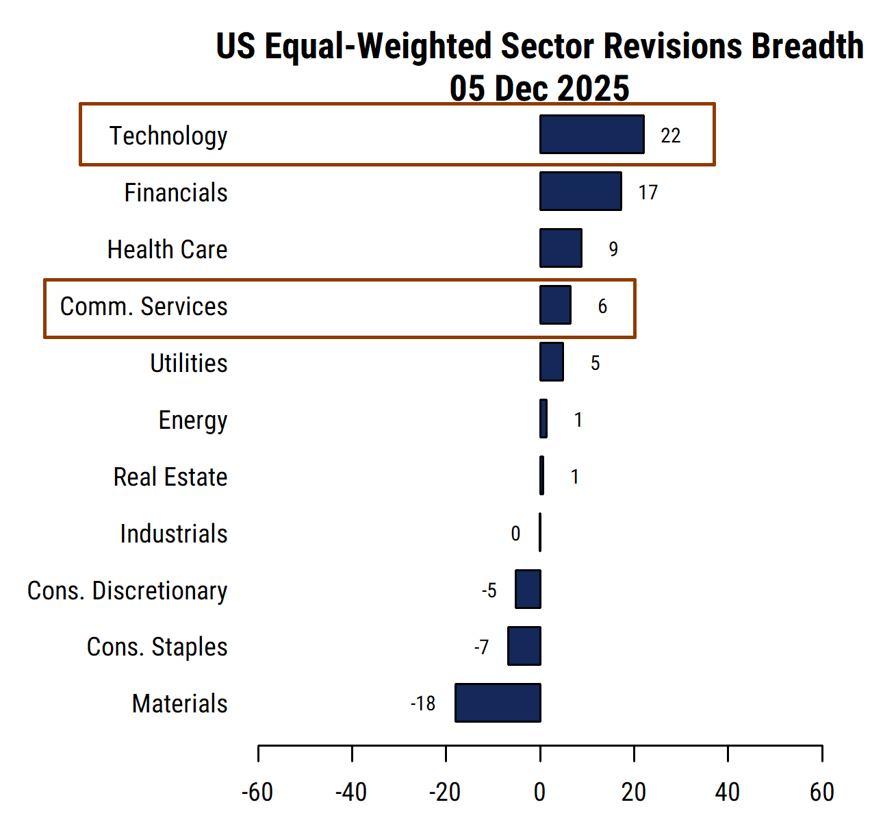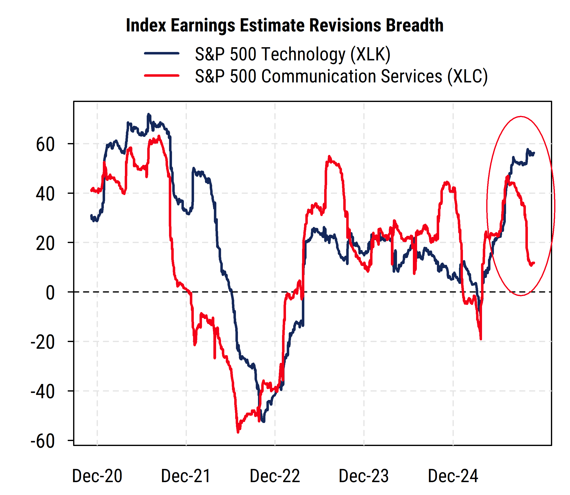 More recently, however, and particularly after Q3 earnings reports, the revisions metrics for the S&P 500 Communication Services sector have declined even while those for Technology have held up at very high levels or even improved.