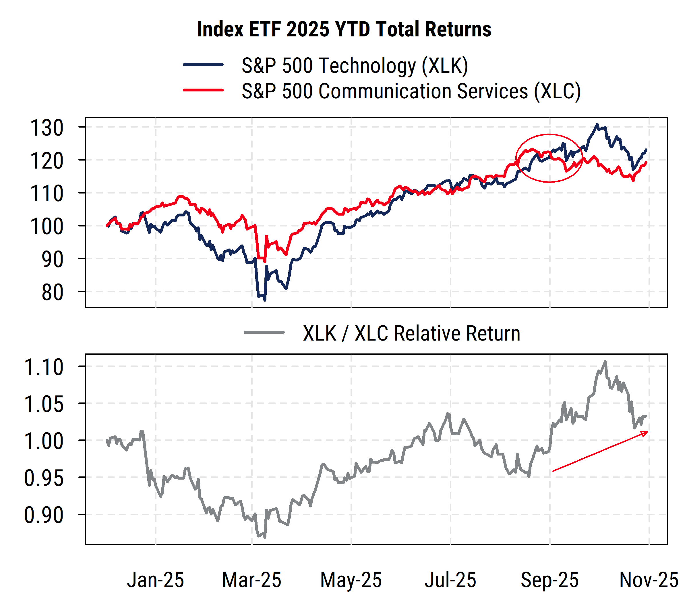 After months (from mid-April to mid-October) of a market that seemed to want to “buy everything risky” and chased anything tied to AI, the backdrop has shifted in the last month or two. We have been guiding clients to favor Tech over Communications Services recently, and arguing for greater selectivity and focus on companies with strong earnings outlooks in general.