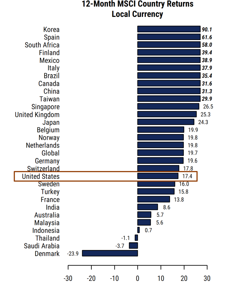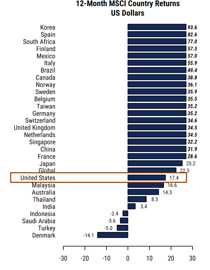 The US S&P 500 has lagged the rest of the world this year by one of the widest margins in many years in US dollar terms. The MSCI USA index (very similar to the S&P 500) returned 17.2% compared to the 32.6% return for the MSCI All-Country World Ex-USA Index in US dollar terms.