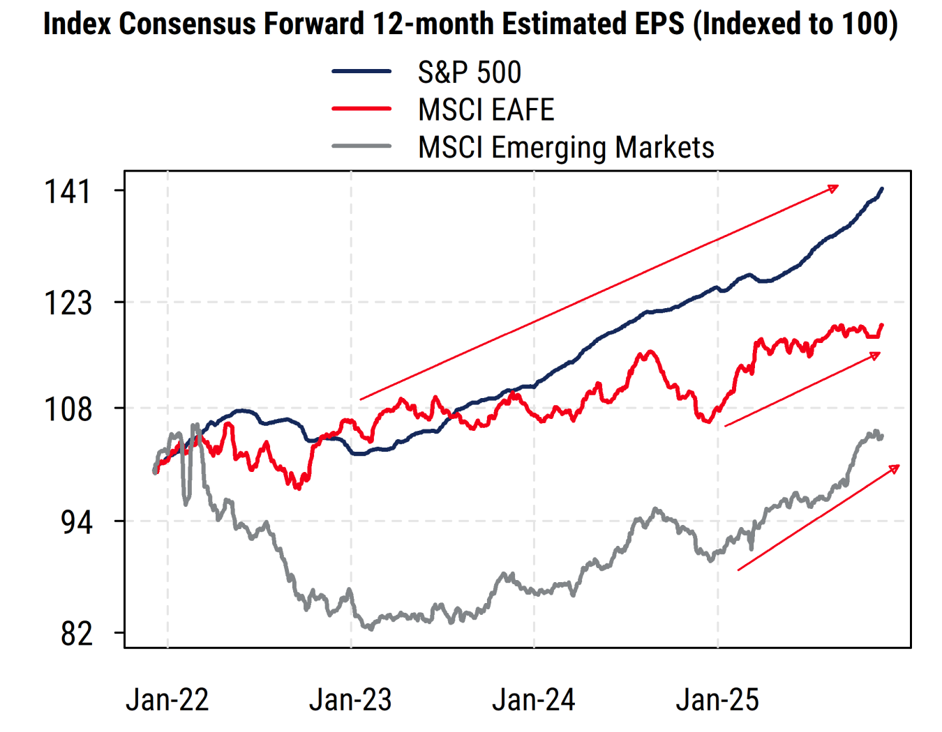 Globally, meanwhile, European fiscal policy is trying to be more supportive (especially for defense against Russia), and rate cuts in Europe are helping earnings some. And Emerging Markets earnings are being helped by places like Korea and Taiwan (benefiting from Tech/AI demand), while Japan has increased its focus on shareholder returns in recent years. China remains a weak spot globally, facing continued economic headwinds.