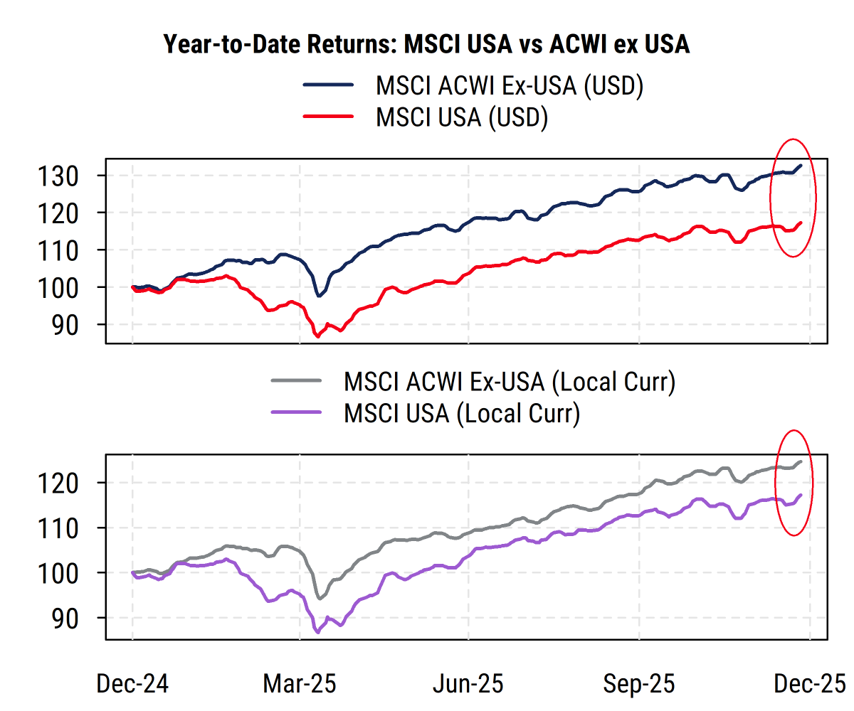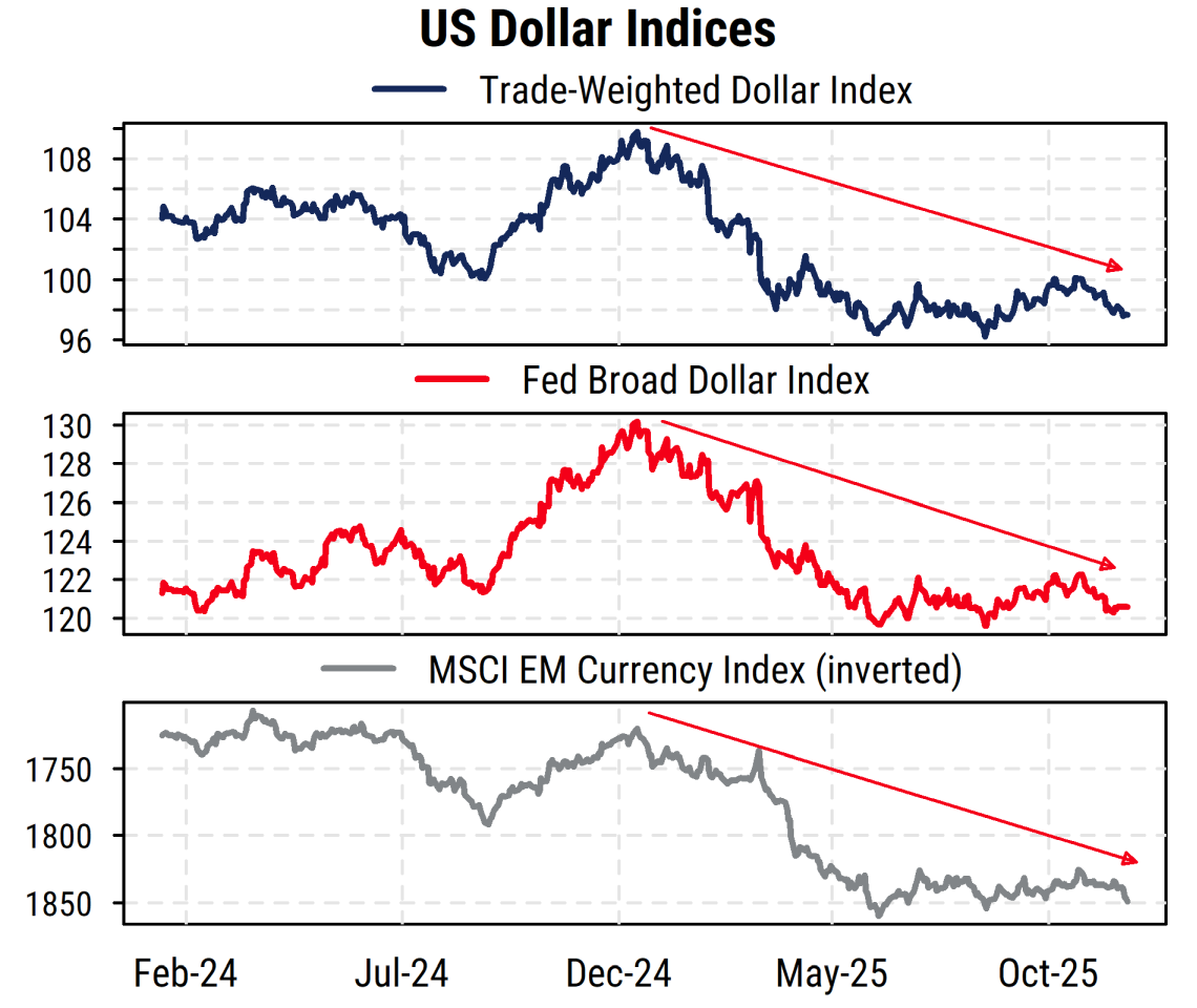 Why have earnings held up despite tariffs and other bad policies? Easier monetary policy is helping, with the Fed resuming rate cuts in September after a long pause for much of the year due to policy uncertainty. And the weaker US dollar is in fact a currency tailwind for earnings of US multinationals (overseas earnings are worth more US dollars).